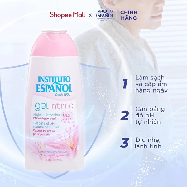 - Gel Vệ Sinh Phụ Nữ Instituto Espanol Gel Intimo 300ml được bào chế với độ pH lý tưởng, hỗ trợ duy trì môi trường tự nhiên của vùng kín, từ đó ngăn ngừa sự phát triển của vi khuẩn và nấm men – nguyên nhân chính gây viêm nhiễm, ngứa ngáy và mùi khó chịu.