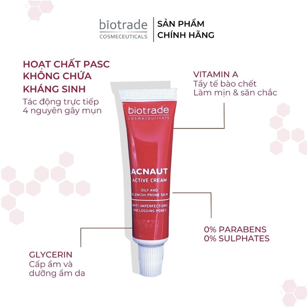 - Kem Chấm Mụn Biotrade Acnaut Active Cream 15ml giúp kháng khuẩn – hạn chế mụn tái phát, một trong những nguyên nhân chính gây mụn viêm là vi khuẩn P.acnes. Kem chấm mụn Biotrade Acnaut Active Cream hỗ trợ: ức chế sự phát triển của vi khuẩn gây mụn, ngăn mụn lây lan sang vùng da xung quanh, giảm nguy cơ tái phát tại cùng vị trí. Nhờ đó, da được bảo vệ tốt hơn trong quá trình điều trị mụn.