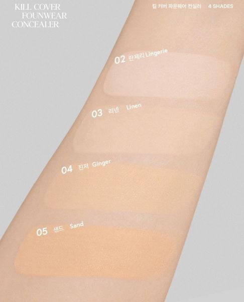 - Kill Cover Founwear Concealer lâu trôi trên da, giúp không để lộ khuyết điểm hoặc làm chảy nền trong nhiều giờ liền.