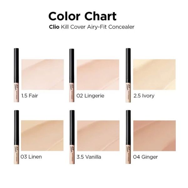 - Clio Kill Cover Airy Fit Concealer là kem che khuyết điểm mỏng nhẹ nhưng có độ che phủ vượt trội, dễ dàng che mờ quầng thâm, vết thâm mụn và vùng da không đều màu. Chất kem mịn, bám lâu, không gây khô hay cakey, mang lại lớp nền tự nhiên và rạng rỡ suốt cả ngày.