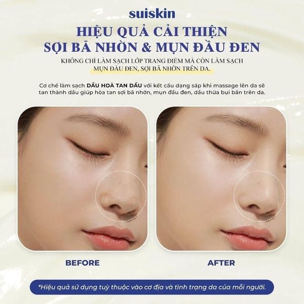 - Sử dụng thường xuyên Suiskin Blooming Canola Cleansing Balm giúp da thông thoáng, sạch sâu, hạn chế bít tắc lỗ chân lông – nguyên nhân gây mụn, mang lại làn da sáng khỏe và mịn màng hơn.