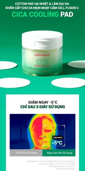 - Toner Pad Hạ Nhiệt, Làm Dịu Cell Fusion C CICA Cooling Pad là dòng pad toner đa năng đến từ thương hiệu dược mỹ phẩm Cell Fusion C nổi tiếng Hàn Quốc. Với thiết kế miếng pad tiện lợi, thấm đẫm dung dịch chứa chiết xuất rau má (CICA) cùng các hoạt chất làm dịu và cân bằng da, sản phẩm giúp hạ nhiệt tức thì, giảm mẩn đỏ, đồng thời cấp ẩm nhẹ nhàng cho làn da nhạy cảm, dễ kích ứng.